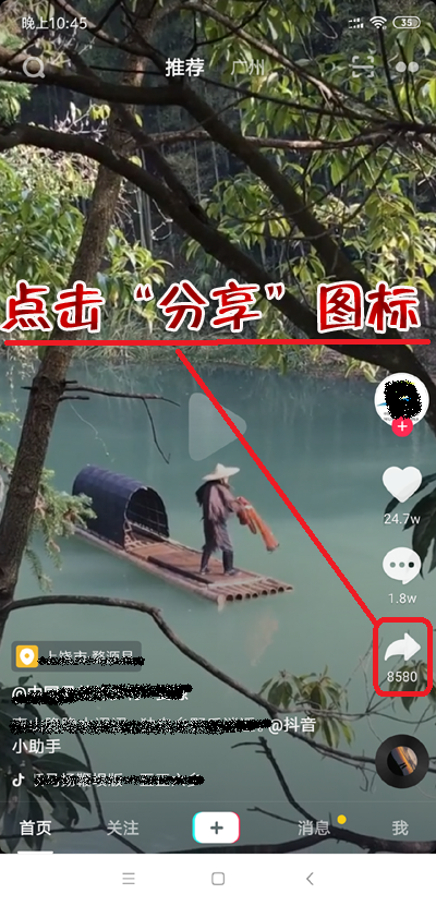 二、在抖音的视频界面,点击“ 分享 ”图标